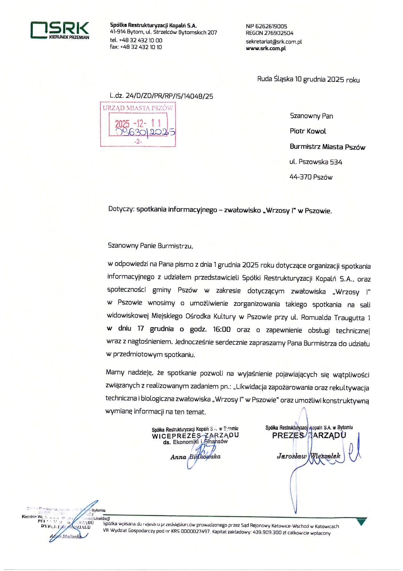 Spółka Restrukturyzacji Kopalń organizuje spotkanie informacyjne dla mieszkańców Pszowa, dotyczące dalszego funkcjonowania i rekultywacji hałdy „Wrzosy I”. Wydarzenie odbędzie się w środę, 17 grudnia, o godz. 16:00 w Miejskim Ośrodku Kultury.